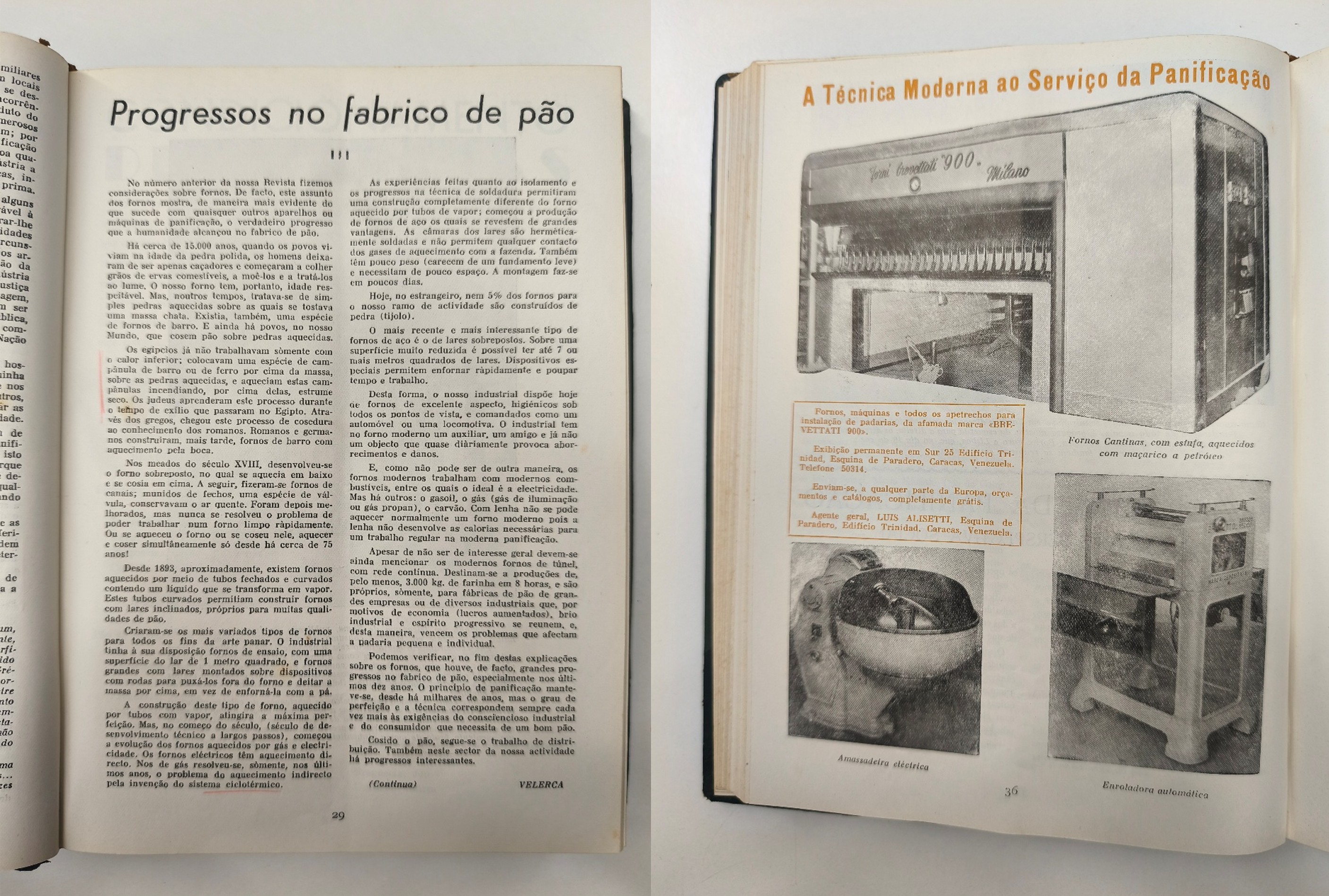 As páginas dedicadas à “Técnica Moderna ao Serviço da Panificação” mostram amassadeiras elétricas, embaladeiras automáticas e fornos mais eficientes.